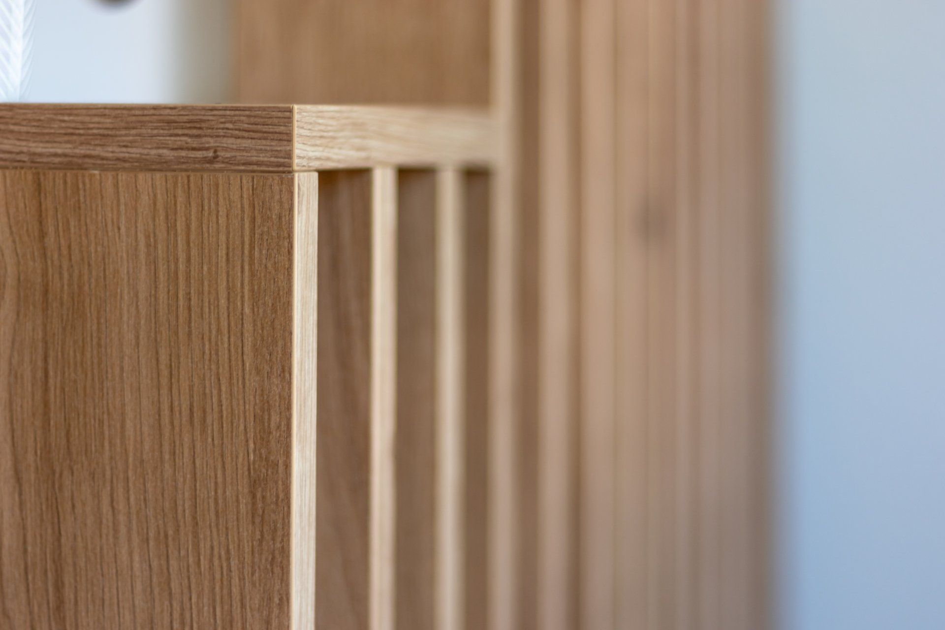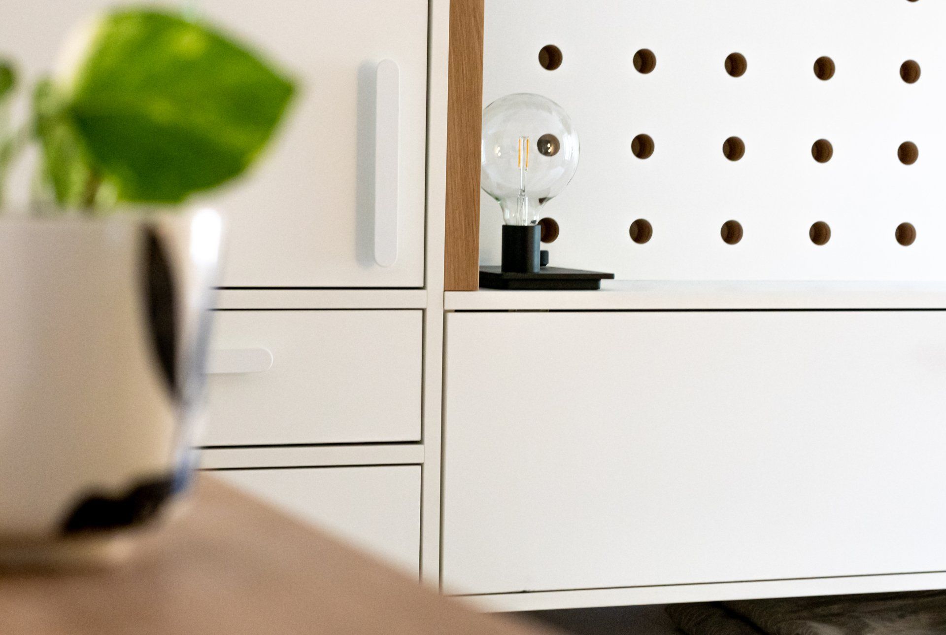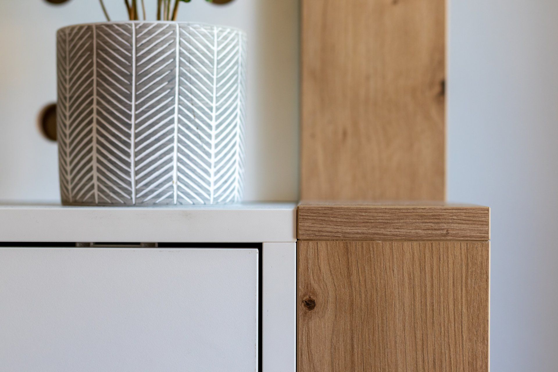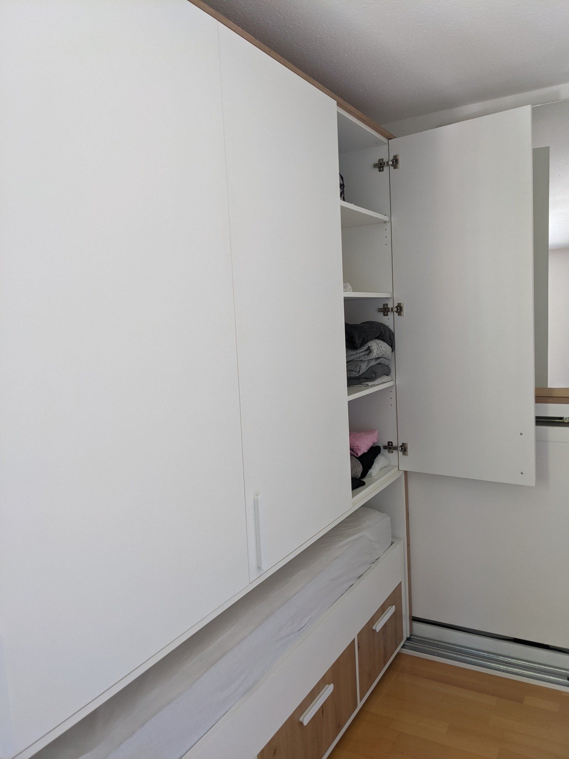 Wir verwenden beschichtete Möbelbauplatten. Auf den Bildern ist die Kombination Weiß/Wildeiche natur zu sehen. Nach Rücksprache lassen sich auf andere Farben & Dekore umsetzen.