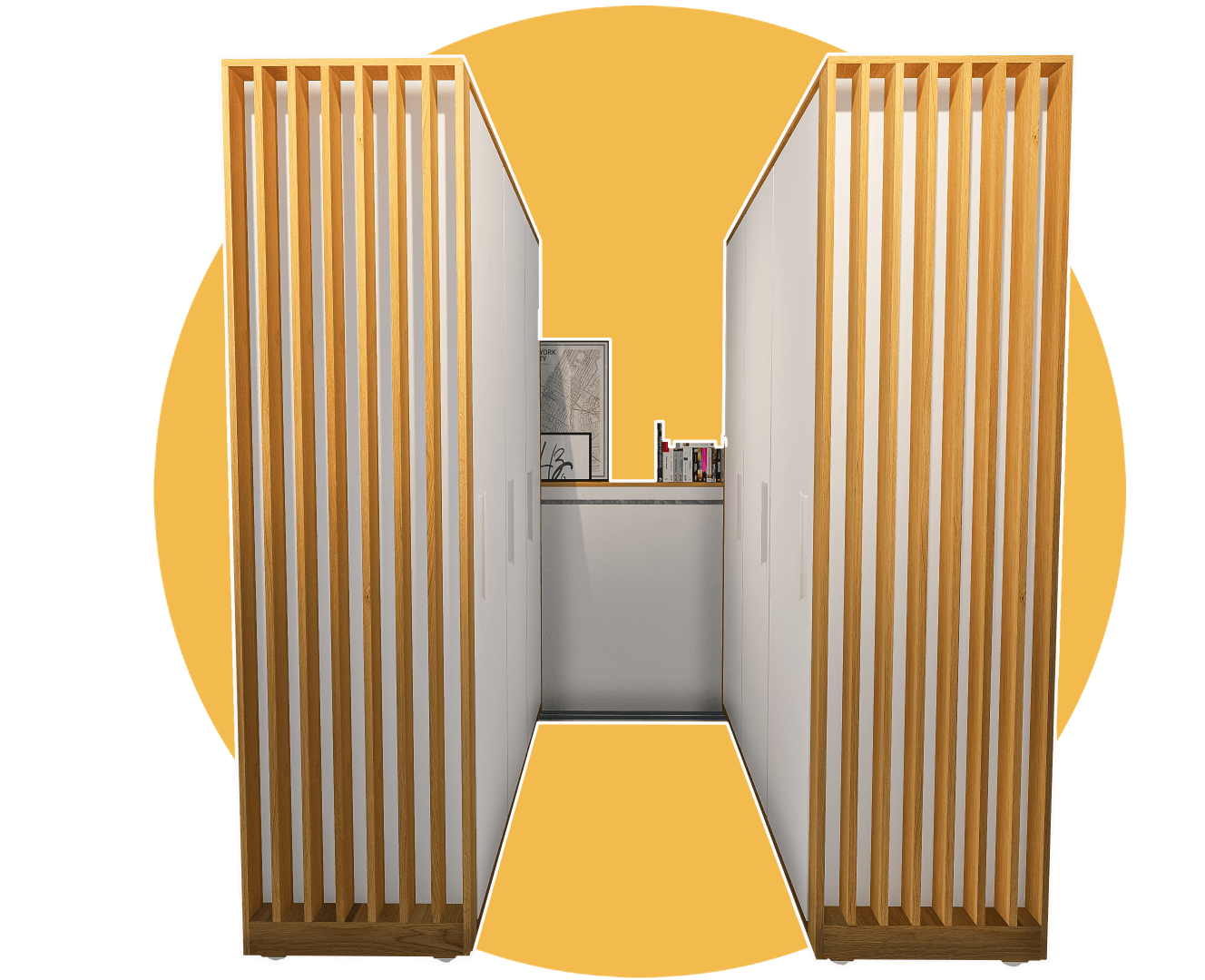 Dieses Wohnelement wurde mit verschiebbaren Möbeln entwickelt. Die einzelnen Positionen des Elementes erzeugen unterschiedlich nutzbare Räume. Das „popup studio“ ist Queensize-Bett, Workstation, Wohnwand, Couch und viel Schrankfläche in Einem. Perfekt für kleine Schlafzimmer, 1-Zimmer-Wohnungen oder Mikro- und Serviced Apartments. Durch die Verschiebung lassen sich die einzelnen Modi genau dann nutzen, wenn sie benötigt werden.