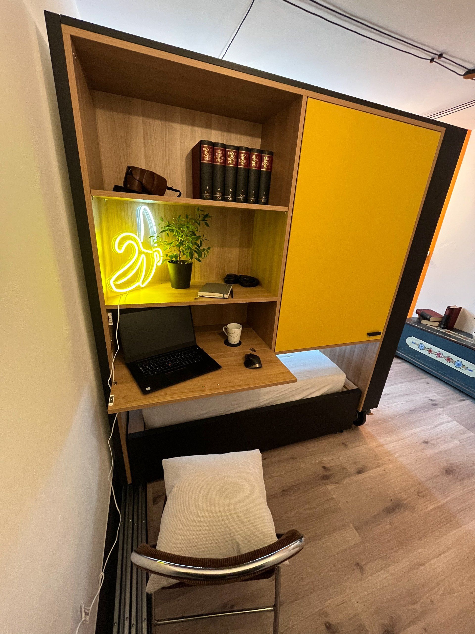 Das Bett ist ein wahres Raumwunder. Wir haben es ein wenig erhöht um den Platz darunter perfekt nutzen zu können.
